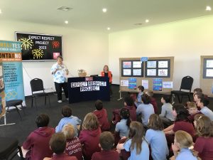 Joy ZCAH presenting the Expect Respect Project to the 2024 Brisbane Zonta Convention. Bev and Julie addressing the children at the end of the project prize giving and celebration 2023.